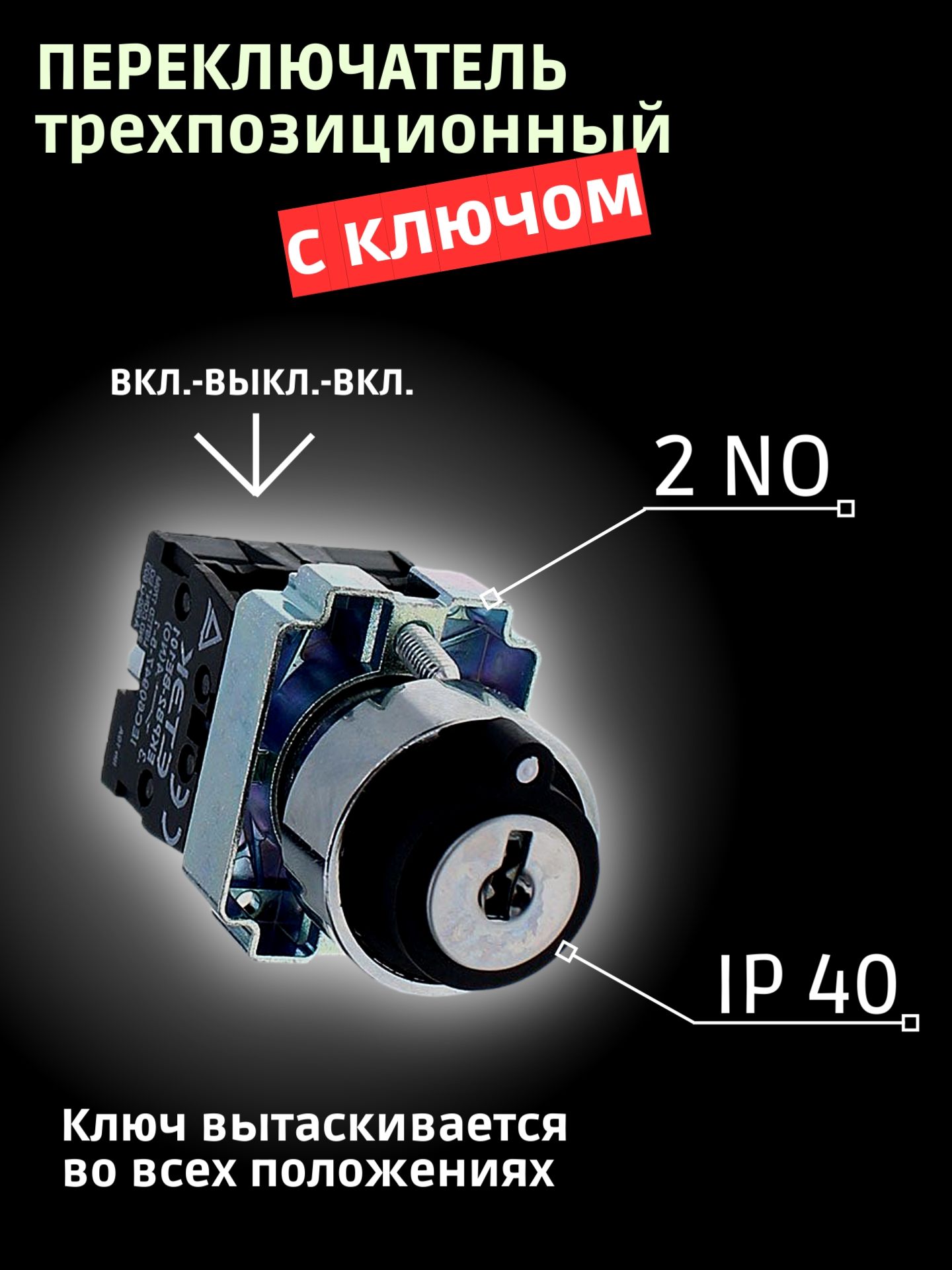 - Переключать между тремя положениями — это приводит к замыканию или размыканию управляющей цепи.